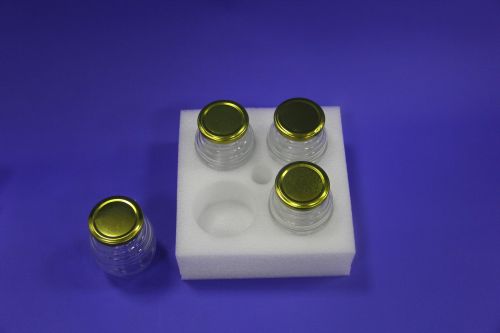 為破局,該品牌引入小型容器專用 EPE 珍珠棉內襯方案:廠家根據(jù)其小樣瓶的尺寸,定制四孔陣列式圓孔結構,每個圓孔與瓶身嚴絲合縫,實現(xiàn) “單瓶獨立固定”;EPE 珍珠棉的閉孔氣泡結構,能高效吸收運輸中的震動與沖擊力,從根源上避免瓶身碰撞;同時,輕量化的材質讓包裝整體重量比傳統(tǒng)泡沫方案降低 20%,物流成本同步縮減。